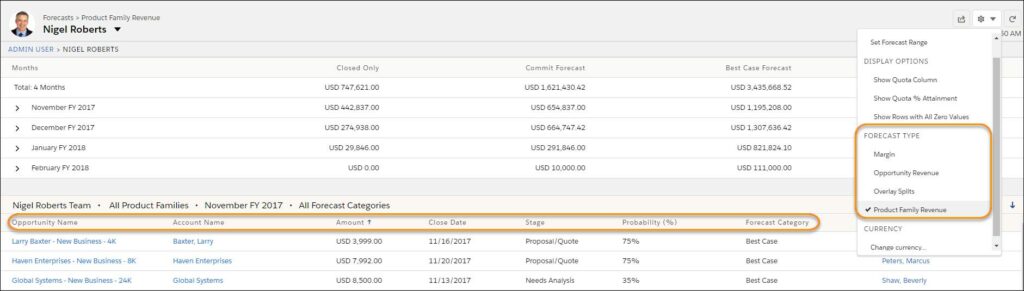 Forecasts will provide a view based on categorisations like ‘Closed’, ‘Commit’ or ‘Best Case’; allowing users to quickly get a handle on which opportunities are ‘real’.