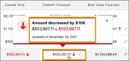 When reviewing forecasts, users can quickly edit values ‘on the fly’; making forecasts a perfect tool for collaborative review sessions. Managers can use forecasts to quickly scan through and sanity-check opportunities with their team and make edits to the amount or close date (and other fields) as required.